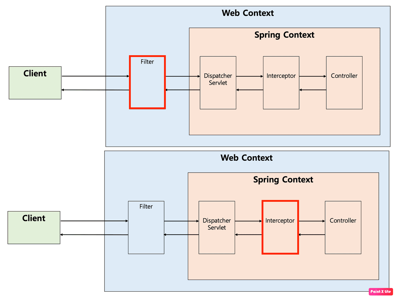 보안과 관련된 부분들을 Filter로 처리하게 됩니다. Intercepter는 Dispatcher와 Controller 사이에 위치해서 적용되지만 Filter로 적용하게 되면 이전에 처리되므로 차이가 있습니다.