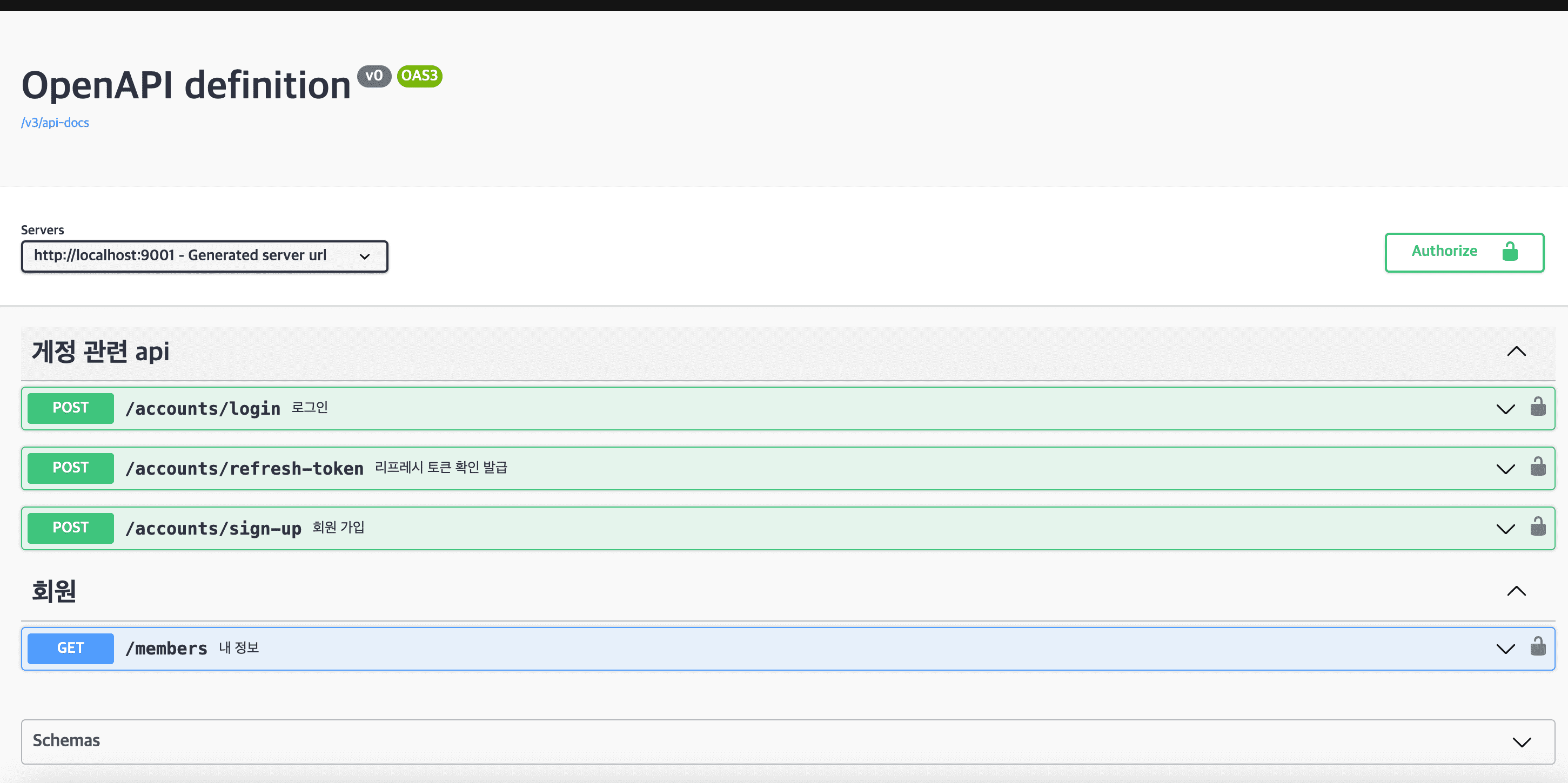 시큐리티에 권한을 설정하고 나서 실행시켜 준다면 http://localhost:9001/swagger-ui/index.html?configUrl=/api-docs/swagger-config#/ 주소로 접속하여 아래 사진처럼 Swagger 설정을 해준 API들이 나오게 됩니다. 처음에는 해당 링크를 몰라 혼동될 수 있으니 위 주소처럼 입력해서 접속하시면 됩니다.